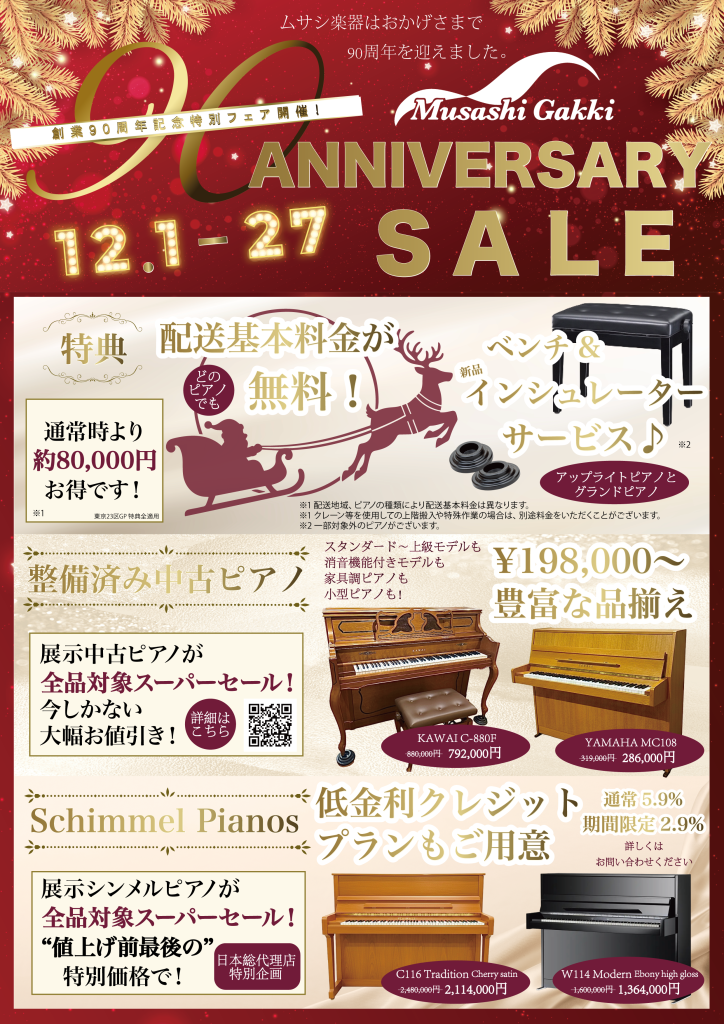 ムサシ楽器90周年 ANNIVERSARY SALE !|12月期間限定のお得な特典&中古・シンメルピアノの特価フェア開催!